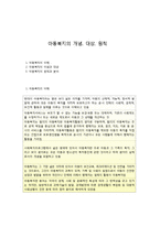 목차 1. 아동복지의 이해 2. 아동복지의 이념과 대상 3. 아동복지의 원칙과 분야 본문 1. 아동복지의 이해 현대의 아동복지라는 말은 보다 넓은 의미를 가지며, 아동의 신체적, 지능적, 정서적 발달에 관하여 모든 아동의 복지를 지키며 보호하고자 하는 공 사 단체의 사회적, 경제적, 보건적 활동과 일체를 이루는 것으로 이해되고 있음 아동복지서비스는 부모가 할 수 없는 기능을 보강 보충 또는 대체하며, 기존의 사회제도를 수정하거나 또는 새로운 제도로서 아동과 그 상태를 개선하는 것 아동복지는 협의의 아동복지와 아동복지활동의 양자로 구분하며, 협의의 아동복지는 주로 공적 책임을 중심으로 하여 법률에 준거하여 행해지는 보호, 원조, 지도, 치료 등 공 사의 서비스를 가리키며, 아동복지활동은 협의의 아동복지를 제외한 아동의 복지를 직접 또는 간접으로 보호 증진함을 목적으로 공 사의 기관이나 모든 사람들에 의해서 행해지는 활동을 가리킴 사회복지프로그램에서 넓은 범위에 있어서 아동복지란 주로 아동과 그 가족의 복지, 그리고 보다 광의로는 모든 아동과 청소년의 복지증진에 관한 것이라고 하여 광의의 실체로서의 개념을 포함하고 있음 아동복지는 그 가장 넓은 의미에 있어서 아동의 보건교육, 레크리에이션 및 안전을 가리키는 것으로서, 그것이 아동복지의 과목이 되며, 가족 및 사회의 일원으로서 아동의 건전한 성장과 발달을 위하여 개인이나 단체에 의해서 행해지는 일체의 활동이 아동복지임 아동복지란 용어는 각국의 경제, 사회 및 문화적인 특성에 따라 그 탄력성을 갖고 있기는 하지만, 일반적으로 과학기술의 발달, 경제발전에 따른 경제생활의 복잡화 및 대중적 사회상황의 진전 등에 따라 점차 광의로 해석하게 되었음 참고문헌 사회복지학개론. 이정서,김상철,박성택 공저. 유풍. 2002 사회복지개론. 김상균. 나남. 2010 사회복지실천기술론: 제너럴리스트 실천 접근= Skills and techniques for generalist social work practice. 조휘일. 학현사. 2005 사회복지실천의 가치와 윤리에 관한 연구. 오혜경. 카톨릭대학교사회복지연구소. 현대사회보장론, 김영모 한국복지정책연구소 출판부. 복지공동체 만들기, 이용교 편(2000), 광주대학교 출판부. 한국 복지국가의 이상과 현실, 인경석(1999), 나남출판. 한국사회복지연감, 한국복지연구원(2000), 유풍출판사. 한국 사회복지의 현황과 쟁점, 한국사회과학연구소(2000), 인간과 복지. 하고 싶은 말 잘 활용하셔서 좋은 결과 얻으세요^^* 키워드 아동복지, 복지, 아동복지의, 아동복, 지의, 발달 |