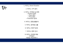목차 1. 박카스 Brand Situation 2. 박카스 STP 분석 3. 박카스 마케팅 4p 전략 ? Product 분석 ? Place 분석 ? Price 분석 ? Promotion 분석 4. 박카스 경쟁상황분석 5. 박카스 문제점 도출 6. 박카스 SWOT 분석 7. 박카스 문제 인식 8. 박카스 마케팅 목표 -STP분석 -새로운 4P전략제시 본문 박카스 홈페이지 혹은 SNS을 이용하여, 분기 별로 특정 주제로 한 사람들의 사연을 올리도록 한다. 커뮤니티 상의 댓글의 수나 추천 수 등을 통해 선정하여, 다양한 문화 공연의 티켓을 발송 기대효과 : 박카스의 희망 이미지 생성. 20~30들의 박카스에 대한 애착도를 상승시켜, 브랜드 로열티를 높여줄 것으로 기대 하고 싶은 말 박카스 마케팅전략 기획서 (박카스 마케팅사례분석과 브랜드분석및 박카스 새로운 마케팅전략 제안 PPT) 입니다. 키워드 박카스, 마케팅기획, 박카스 마케팅, 박카스광고, 비타500 |