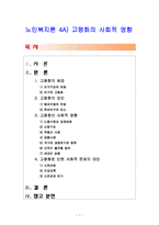 목차 Ⅰ. 서 론 Ⅱ. 본 론 1. 고령화의 배경 1) 인구구조의 변화 ; 2) 인구의 고령화 2. 고령화의 요인 1) 평균수명의 연장 2) 유년인구의 감소 3. 고령화의 사회적 영향 1) 노동시장과 경제성장 2) 산업구조 3) 부동산 시장 4) 금융시장 5) 국가의 재정위기와 정책 6) 지역간 불균형 발전 7) 세대간 갈등 4. 고령화로 인한 사회적 문제의 대안 1) 소득보장 2) 건강대책 3) 소외감과 여가 Ⅲ. 결 론 Ⅳ. 참고 문헌 본문 Ⅰ. 서 론 급속한 사회변화에 따라 인구학적 측면에서 고령화의 증가속도가 매우 빠르다. 우리나라 노인의 수가 증가한다는 것만으로 사회적 문제가 되는 것은 아니지만, 최근 급격한 인구의 고령화는 그 자체만으로도 중요한 사회문제로 인식되기에 이르렀다. 그것은 노인인구의 빠른 증가에도 불구하고 사회의 주요 제도들이 보조를 맞추지 못하고 욕구를 적절히 수용하지 못하고 있어 더욱 고령화로 인한 노인 및 사회문제를 야기하고 있다. 예컨대 노인인구가 점차 증가하여 1996년에 전체 인구의 5.8%인 264만 명에서 2000년에는 6.8%인 317만 명으로, 2001년에는 9.4%인 467만 명까지 증가할 것으로 추계되어 우리사회도 선진국형의 고령화가 예상된다. 따라서 통계청에 의하면 경제적, 사회적 문제가 본격화되고 있음을 고령자 실태에서 밝히고 있다. 노인인구의 증가는 단지 수적인 면의 증가가 아니라 총 인구에 대한 비율도 증가하고 있는 추세이다. 그러므로 노령인구에 대한 절대수의 증가는 노령과 관련된 노인문제를 가진 노인의 수를 증가시킬 것이며, 이에 인구의 고령화로 인해 미칠 사회적 영향은 더욱 심할 것이라 본다. Wallice(1999)는 "Agequake" 라는 신조어를 사용하여 인구고령화가 사회에 미치는 파장을 지진에 비유하고 있다. 그만큼 한 국가의 인구고령화는 산업구조, 재정과 금융, 주택시장, 문화, 직업 환경 등 전체 사회에 강하고 큰 영향을 미친다. 그리고 고령화 사회를 "Gray Dawn"에 비유하여 앞으로 펼쳐질 고령사회는 회색빛으로 물든 불안한 사회가 될 것임을 경고하고 있다. 인구의 고령화가 가속되는 시점에서 고령화에 대한 사회적 대책은 현저히 미비하다고 할 수 있다. 이에 본문에서는 고령화로 인한 사회적 영향에 대해 살펴보고 이러한 고령화가 사회적으로 미치는 영향을 축소할 수 있는 방안에 대해 논해보고자 한다. Ⅱ. 본 론 1. 고령화의 배경 1) 인구구조의 변화 통계청이 발표한 장래인구추계 (2004)에 따르면 2000년 우리나라 인구는 4,700만 8천명으로 이는 지난 1995년의 4,509만 3천여 명보다 191만 5천여 명 참고문헌 1. 표갑수(2010), 사회복지개론, 나남 2. 김기태 외 공저(2009), 사회복지의 이해, 박영사 3. 박석돈 외 공저(2008), 노인복지론, 양서원 4. 박용순 저(2008), 사회복지개론, 학지사 5. 권중돈 저(2004), 노인복지론, 학지사 6. 공윤식 외 공저(2003), 사회복지개론, 현학사 7. 이정서 외 공저(2002), 사회복지학개론, 유풍출판사 8. 김수영 저(2001), 노인과 지역사회보호, 양서원 9. 김태성 외 공저(2000), 복지국가론, 나남 10. 최순남 저(2000), 현대노인복지론, 한신대학교출판부 하고 싶은 말 1. 환경보건학과 4학년, 노인복지론 A형 항목 참고자료입니다. 2. 고령화의 사회적 영향을 4가지 기술하시오 3. 본 자료는 서론, 본론, 결론, 참고문헌 형식으로 작성되었습니다. 4. 주어진 논제에 맞게 정성들여 꼼꼼히 작성하였습니다. 5. 미리보기 및 세부목차 사항을 참고하시면 상세한 정보 확인이 가능합니다. 6. 본 자료가 학업에 많은 도움 되길 바라며, 학업에 무궁한 발전이 있기를 기원 합니다 키워드 고령화, 노령화, 고령화의 원인, 고령화의 요인, 고령화의 사회적 영향, 고령화의 영향, 고령화 문제, 노인복지론, 환경보건학과 |