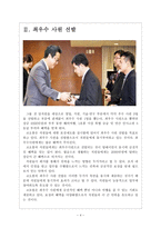 목차 목 차 Ⅰ. 능력과 업적 위주의 보상 Ⅱ. 최우수 사원 선발 Ⅲ. 코오롱 페스티벌 Ⅳ. 다양한 포상제도 Ⅴ. 현금으로 즉시 지급 본문 Ⅰ. 능력과 업적 위주의 보상 코오롱그룹은 2년마다 한 번씩 그룹 최우수 사원을 선발해 시상하고 있다. 직원들의 사기를 끌어올리고 능력과 업적에 따른 포상을 실시함으로써 기업 체질을 강화하기 위해서다. 코오롱은 다양한 사업에 진출하여 활발하게 경영활동을 실시하고 있는 기업이다. 우수한 기업역량을 바탕으로 하여 시장에서 높은 성과를 달성하고 있다. 코오롱의 이러한 성과 창출은 효과적인 인사관리가 밑바탕이 된 결과이다. 기업이 시장에서 생존하고 이익을 창출하기 위해서는 인사관리가 매우 중요하다. 효과적인 인사관리를 통해서만 기업이 가치를 향상시킬 수 있기 때문에 인사관리에 대한 노력을 기울여야 하는 것이다. 참고문헌 참고자료 http://www.hankyung.com/news/app/newsview.php?aid=2013031935521 <한국경제> http://www.boannews.com/media/view.asp?idx=35865&kind=1 <보안뉴스> http://www.newstomato.com/ReadNews.aspx?no=358393 <뉴스토마토> http://biz.chosun.com/site/data/html_dir/2013/04/26/2013042602155.html <조선비즈> http://www.ohmynews.com/NWS_Web/View/at_pg.aspx?CNTN_CD=A0001859296 <오마이뉴스> http://www.newstomato.com/ReadNews.aspx?no=358310 <뉴스토마토> http://www.ohmynews.com/NWS_Web/View/at_pg.aspx?CNTN_CD=A0001858955 <오마이뉴스> http://www.womennews.co.kr/news/57516 <여성신문> http://view.asiae.co.kr/news/view.htm?idxno=2013042614005577491&nvr=Y <아시아경제> http://www.newstomato.com/ReadNews.aspx?no=358198 <뉴스토마토> 하고 싶은 말 코오롱인사관리 코오롱 인적자원관리 보고서 키워드 코오롱, 인사관리, 인적자원관리 |