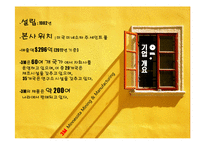 목차 1.기업 개요. 2.외부환경분석 3.내부환경분석 4.사업부 수준의 전략 5.전사적 수준의 전략 6.결론 및 시사점 본문 -설립 : 1902년 -본사 위치 : 미국 미네소타 주 세인트 폴 -매출액 $296억 (2011년 기준) -3M은 60여 개 국가 에서 자회사를 운영하고 있으며, 이 중 29개국은 제조시설을 갖추고 있으며,35개국은 연구소 시설을 갖추고 있다. -3M의 제품은 약 200여나라에서 판매되고 있다. Value 1. 창의적 생각을 제품에 도입하여 시장의 주도권을 행사 2. 기업의 전 사업부에서 최고의 퀄리티 제품을 생산하여 브랜드 인지도를 상승 3. 최신 제품의 판매를 위한 확실한 유통구조를 활용 함 4. 고객과의 제품 개발로 긴밀감을 형성하여 높은 부가가치 생산 함 5. 비교우의를 활용하여 생산시설을 구축하여, 전 세계에 물량을 공급함 고객의 욕구를 만들 수 있는 제품을 최고의 퀄리티로 생산하여 계속적인 시장 선두 주자를 역할을 하여 시장의 판도를 결정하여 최고의 부가가치를 생산함 Environment 환경정책 1997년부터 신제품 개발부터 환경, 보건, 안전에 대한 영향을 고려하는 Life Cycle Management System을 도입해 실행하고 있다. - 공해 발생을 원천적으로 예방한다. - 우선 우리 회사와 관련된 부분에서부터 환경보호 노력을 시작한다. - 환경에 최소 영향을 미치는 제품을 개발한다. - 재활용 등을 통해 천연자원을 보전한다. - 정부의 규정을 지키고 또 지지한다. - 가능한 정부 기관들의 환경 관련 사업들을 지원한다. 키워드 환경, 제품, 부가가치, 시장, 퀄리티, 3M |