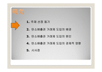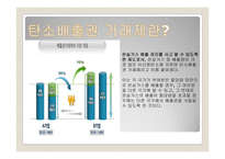 목차 1.주제 선정 동기 2.탄소배출권 거래제 도입의 배경 3.탄소배출권 거래제 도입의 원인 4.탄소배출권 거래제 도입의 경제적 영향 5.시사점 본문 탄소배출권 거래제란? 온실가스 배출 권리를 사고 팔 수 있도록 한 제도로서, 온실가스 중 배출량이 가장 많은 이산화탄소에 의하여 탄소배출권 거래제라고 이름 붙여졌다. 이는 각 국가가 부여받은 할당량 미만으로 온실가스를 배출할 경우, 그 여유분을 다른 국가에 팔 수 있고, 그 반대로 온실가스의 배출이 할당량을 초과할 경우에는 다른 국가에서 배출권을 사들일 수 있도록 한 것이다. 1. 주제 선정 동기 - 탄소배출권 거래제 국회 통과 2012년 5월 2일 탄소배출권 거래제가 국회를 통과함에 따라 우리나라도 2015년부터 탄소배출권 거래제를 시행하게 됨 탄소가 돈이 되는 이른바 탄소머니 시대가 열릴 것이라 생각 탄소 배출권 거래제가 특별한 것은 환경 문제를 탄소시장이라는 새로운 시장 을 만들어 해결하려고 했기 때문. - 녹색기후기금(GCF) 유치 GCF (Green Climate Fund)란 ? - UN 산하 기관으로 선진국이 개발도상국의 온실가스 감축과 기후변화 적응을 지원하기 위해 만든 기후변화 특화 국제기금 쉽게 말하자면 녹색기후기금은 환경문제를 해결하기 위해 들어가는 자금을 관리하는 환경분야의 세계은행이라고 할 수 있음 그림에서 보시다시피 일자리 창출, 연간 3.800억원 규모의 경제적 효과를 가져옴 GCF유치로 인해 탄소배출권 거래사업에 날개를 달아줌 1. 1992년 3월 브라질 리우에게 개최된 UN환경개발회의에서 만들어진 기후변화협약(UNFCCC)에서 지구온난화에 대한 범지구 차원의 노력이 필요하다는 인식을 바탕으로 회원국에게 온실가스를 감축 하도록 권고. ↓ 2. 교토의정서가 1997년 12월 제3차 당사국총회에서 채택됨으로 90년 수준보다 평균 5.2%감축하되 각국별 차별화된 배출량을 규정. 3. 2011년 제 17차 당사국총회에서 교토의정서 연장에 타결함으로써, 향후 국제 기후변화 대응체제에 새로운 돌파구 마련. 또 모든 당사국은 새로운 기후변화협약을 위한 협상을 2015년까지 완료하고 2020년부터 개도국에도 적용되는 새로운 체제 출범에 합의해 더반 플랫폼 기반이 구축. ↓ 4. 2020년부터 발효될 더반 플랫폼은 교토의정서에 비해 미국, 중국, 인도 등 온실가스 감축의무를 부여받지 않은 주요 배출국들이 참여 의사를 표명했고, 모든 당사국이 법적 구속력이 있는 규제를 받게 됨. ▶온실가스 배출로 인한 지구온난화 ▶산업화 진행으로 이산화탄소 농도 급증 ▶평균기온 및 해수면 상승과 극지방 면적의 감소 ▶기상이변으로 인한 자연재해 키워드 배출권, 탄소, 거래제, 온실가스, 탄소배출권 |
