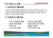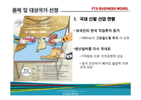 목차 1.FTA 비즈니스 모델 2.품목 및 대상국가 선정 3. 한계 및 대응전략 본문 Fta 비즈니스 모델 FTA 비즈니스 모델 이란? 수출자가 상품의 경쟁력 강화를 위해 FTA 네트워크, 품목별 관세율 구조 및 원산지 규정 등을 활용하여 원재료 공급, 중간재 조달 및 생산을 가장 효율적으로 함으로써 FTA별, 품목별로 최적의 특혜원산지 전략을 수립하고 집행하는 절차와 과정을 의미한다. 2. FTA 비즈니스 모델 유형 FTA 관세혜택 활용 품목 분류 활용 FTA 허브 유관기관 협력 원산지 결정 활용 관세 행정 제도 활용 물류비 절감 지역 특화 산업 국내 신발 산업 현황 외국인의 한국 직접투자 증가 M&A보다 그린필드형 투자 더 선호. 생산설비를 다시 국내로 FTA발효 이후 가격경쟁력 상승 중국 인건비가 베이징 올림픽 이후 크게 상승 3. 대상국가 선정 : 미국 한 미국 자유무역협정(FTA) 한미 FTA 협상 타결 : 2007년 4월 2일 한국 국회비준 : 2011년 11월 22일 이명박 대통령 한미 FTA 이행법안 서명 : 2011년 11월 29일 한미 FTA 발효 : 2012년 3월 15일 미국 시장의 중요성 우리의 2대 수출상대국 수출의 10.7%를 차지하는 매우 중요한 시장. 세계의 경영 기술 트렌드 표준과 정보 지식화를 선도하는 국가 세계 신기술을 경쟁하는 세계 최대 규모의 '테스트 마켓(Test Market)' 키워드 FTA, 신발, 비즈니스, 산업, 모델 |