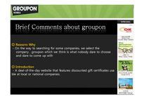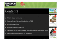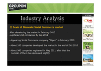 목차 1.What is Social commerce 2.Reasons for and simple introduction of S.C 3.An industry analysis 4.Strategic analysis of the firm 5.Evaluations of the firm's strategy and identification of strategic issues 6.Practical Recommendations for the future 본문 What is Social Commerce Social Commerce - A type of e-commerce making use of Social Network service(SNS) - The term social commerce was introduced by Yahoo! in November 2005 Characteristic of Social Commerce - Consumers actively part in promoting the product on the SNS to satisfy the minimum volume of sale Brief Comments about groupon Reasons Why - On the way to searching for some companies, we select the company , groupon which we think is what nobody dare to choose and dare to come up with Introduction - A deal-of-the-day website that features discounted gift certificates usable at local or national companies. Industry Analysis Scale of Domestic Social Commerce market After developing the market in February 2010 registered 450 companies By Sep 2011 - Appearing Social Commerce company "Wipon" in February 2010 - About 100 companies developed the market in the end of Oct 2010 - About 500 companies registered in May 2011, after that the number of them has decreased slightly 키워드 Groupon, 그루폰, 전략, 영문, 분석 |