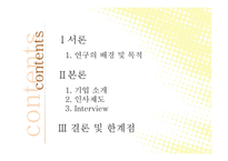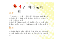 목차 Ⅰ서론 1. 연구의 배경 및 목적 Ⅱ본론 1. 기업 소개 2. 인사제도 3. Interview Ⅲ 결론 및 한계점 본문 연구 배경&목적 배경 LG Display는 경쟁 기업인 삼성 Display 보다 빠르게 소비자들의 성향과 시장 흐름을 파악하고 새로운 시장을 개척하고 있다. 하지만 삼성 Display에 1위 자리를 뺏기고 만다. 이런 현상을 보면서 우리는 .LG Display에 알아보고자 한다. 목적 인적자원관리에 대한 연구를 통해 현재 LG Display가 2위 자리를 선점하게 되는 요인을 분석하고자 한다. LG Display는 LG 전자에서 설립한 기업으로, LCD와 OLED, Flexible 디스플레이 사업을 전개하는 회사이며 서울에 본사를 두고 있다. 현재 직원은 임원을 제외, 총34,813명이다. 3개의 모듈 공장, 7개 판매 법인, 7개 판매 지사, 3개의 R&D센터를 가지고 있다. 경쟁력 Innovative Technology + 상생경영 IPS 는 액정이 수평으로 구동되는 원리로, 시야각이 넓고 응답속도가 빠르며 Simple한 Pixel구조를 가지고 있습니다. FPR 은 하나의 화면을 좌우로 분할하여 보여줌으로써 입체감을 구현하는 차세대 3D 기술입니다. 3-Way 협력 관계 상생전문조직 운영 전사적 지원조직 근본적 경쟁력 확보지원 장기적이고 능동적인 One Team 과제수행 아낌없는 물적 인적자원의 완전한 정보공유 경청, 배려문화 정착 지원 Three-way, 수직/ 수평 방식 참고문헌 http://www.asiae.co.kr/news/view.htm?sec=it99&idxno=2012052210150637852 http://www.ebn.co.kr/news/n_view.html?id=528581 http://www.lgdisplay.com/lgdhp/app/company/power.dev http://www.lgdisplay.com/ http://news.khan.co.kr/kh_news/khan_art_view.html?artid=201203281918005&code=920401 http://dart.fss.or.kr/dsaf001/main.do http://blog.yahoo.com/_7I5XEDQABHX3AHG5ENTUKOLSKI/articles/65994 고객의 마음을 사로잡다 CI팀을 통해 알아보는 소비자 insight http://blog.naver.com/youngdisplay http://blog.naver.com/youngdisplay?Redirect=Log&logNo=60162883518 http://blog.naver.com/youngdisplay?Redirect=Log&logNo=60162744153 http://www.lgenius.com/2010/page/intro.asp http://www.newstomato.com/RealTime/RealTimeDetail.aspx?no=172977 http://www.etnews.com/news/device/device/2491510_1479.html 키워드 LG 디스플레이 인적자원 관리, LG 디스플레이, 인적자원 관리 |
