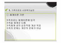 목차 1. 가족치료와 사회복지실천 ○ 체계이론 기반 ○ 가족치료사의 관심사항 ○ 가족치료 ○ 가족의 변화 ○ 부부 문제에 대한 전문가의 개입 정도 ○ 가족 기능의 변화 ○ 기존 가족 기능 대체 본문 1) 가족치료의 정의 ○ 가족 대상의 사회복지실천 방법 가족치료, 가족교육, 가족상담, 사례관리 가족치료가 가장 널리 알려지고 가장 중심이 됨 ○ 체계이론 기반 가족치료는 체계이론에 입각 가족을 체계로 다룸 가족체계 내의 상호작용 개선 목표 가족의 문제는 개인의 문제가 아님 ○ 가족치료사의 관심사항 해결과제 자체가 아니라 과제를 둘러싼 하위체계의 행동패턴에 중점을 둠 결함모형 (문제원인 : 개인 - 개인성격이상) ↓↓↓ 대인관계적 모형 (문제원인 : 관계 ? 관계적 스트레스) 키워드 가족복지, 사회복지실천, 가족치료 |