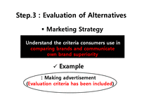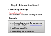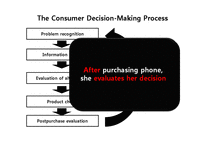 목차 1.The Consumer Decision-Making Process 2.Step.1 : Problem recognition 3.Step.2 : Information Search 4.Step.3 : Evaluation of Alternatives 5.Step.4 : Product choice 6.Step.5 : Postpurchase Evaluation 7.Involvement 8.Internal Influences on Consumers' Decisions 9.1.Perception 10.Case 1. subliminal advertising 11.2.Motivation 12.3. Learning 13.Cast 3 Brand: Beksul 14.4. Attitudes 15.Case 4 16.5. Personality and the self 17.6. Age Groups 18.7. Lifestyle 19.External Influences 본문 There is a consumer decision-making process, as you can see. The consumer decision-Making Process consists of 5 steps like this picture. For example, 은주 want her phone to change smart phone. This step is a problem recognition. So, 은주 collect information by searching Internet, listening to advices of her friends who are using them, watching advertisement, or visiting a store, or something like that.This is information search step. And Then, 은주 compares with some different products according to her important criteria. She thinks what is strength and what is weakness about each different products. This is a third step, Evaluation of alternatives. Finally, 은주 choose one of alternatives, it is best for her. It is product choice. The consumer decision making process is not finished yet. The last step is postpurchase evaluation. It means that she is finally thinking whether her decision is good or not. So, Marketers should make a strategy fitted to each step. 키워드 의사결정, 소비자, 과정, 의사, 결정 |