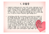 목차 1. 우울증 2. 임신우울증 3. 산후우울증 4. 사례 5. 출처 본문 1.우울증 우울증은 우울장애라고도 하며 의욕 저하와 우울감을 주요 증상으로 하여 다양한 인지 및 정신 신체적 증상을 일으켜 일상 기능의 저하를 가져오는 질환을 말한다. 우울장애는 평생 유병율이 15%, 특히 여자에서는 25% 정도에 이르며, 감정, 생각, 신체 상태, 그리고 행동 등에 변화를 일으키는 심각한 질환이다. 이것은 한 개인의 전반적인 삶에 영향을 준다. 건강보험심사평가원 2005년부터 2009년까지의 우울증 진료 인원을 분석한 결과, 43만 5천명이던 진료 환자수가 4년만에 50만 8천명으로 16.8% 증가한 것으로 밝혀졌다. 성별로 보면 남성이 15만 3천명인데 비해 여성이 35만 4천명으로 남성에 비해 여성 환자가 2배 이상 많은 것으로 보고되었다(건강보험심사평가원,2010). 이처럼 2배 이상의 많은 차이가 나는 이유에는 분명 많은 이유가 있겠지만 가장 큰 원인은 여성의 임신과 출산으로 인한 많은 제약점들 때문일 것이다. 수많은 여성들이 여자가 아닌 어머니가 되기 위한 과정에서 산후조리, 양육, 가사, 직장으로의 복직 등 스트레스를 유발하는 많은 이유로 인해 산후우울증에 걸릴 확률이 높다. 참고문헌 http://health.naver.com/medical/disease/detail.nhn?diseaseSymptomCode=AA000353&diseaseSymptomTypeCode=AA&selectedTab=detail#con 네이버건강(질병/의학). 우울장애. http://100.naver.com/100.nhn?docid=780890 네이버백과사전. 임신우울증. http://100.naver.com/100.nhn?docid=753521 네이버백과사전. 산후우울증. http://health.naver.com/medical/disease/detail.nhn?diseaseSymptomCode=AA000617&diseaseSymptomTypeCode=AA&selectedTab=detail#con 산후우울증. http://www.vitaminmd.co.kr/dic/disease/harvard/view.md?diseaseid=000Oc 산후우울증. http://jangyui.net/index.php?document_srl=5895&mid=mam_o9 산후우울증. http://health.chosun.com/site/data/html_dir/2011/02/11/2011021101533.html 산후우울증 기사. http://news.sportsseoul.com/read/entertain/1020319.htm 산후우울증 기사. http://www.newsen.com/news_view.php?uid=201203230956561001 산후우울증 사례. 이제영(2011). 산후 우울 성향 어머니와 6-8개월 영아의 놀이상황 상호작용 분석. 한신대학교. 임성진(2011). 산후 우울감을 보이는 산모에서 나타나는 전두엽 뇌파 비대칭에 대한 음악의 영향. 충북대학교. 키워드 우울증, 아동발달, 산후우울증, 임신, 예방법, 치료 |