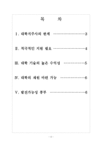 목차 목 차 Ⅰ. 대학지주사의 한계 3 Ⅱ. 적극적인 지원 필요 4 Ⅲ. 대학 기술의 높은 수익성 5 Ⅳ. 대학의 재원 마련 가능 6 Ⅴ. 발전가능성 풍부 6 본문 Ⅰ. 대학지주사의 한계 이제까지 대학 지주사는 벤처캐피털 등 자본시장 플레이어들과 격리돼 있었다. 대학 내 벤처는 대학 재정 지원을 받는 대학 지주사 등에서 투자를 받는 것이 고작이었다. 대학에서 탄생한 원천기술이 사장되는 것을 막기 위한 금융자본 역할이 커지고 있다. 대학교는 우수한 인재들이 학문을 배우는 곳이다. 대학교에서는 교수진을 중심으로 하여 우수한 인재들과 함께 다양한 연구활동을 벌이게 되는데 이러한 연구를 통해서 성과가 발생하기도 한다. 우리나라의 경우에는 다른 나라에 비해서 대학교 진학률이 높은 편이다. 이는 많은 국민들이 높은 상위 교육을 받는 다는 것을 의미한다. 그만큼 국가적인 교육수준이 높다는 것을 의미하기도 한다. 많은 사람들이 대학교에 진학하고 우수한 인재들이 대학을 통해서 양성됨에 따라서 대학이 새로운 가치 창출 지역으로 여겨지고 있다. 대학에서 우수한 인재들을 바탕으로 연구활동을 하게 되면 성과를 통해서 이익이 창출되는 것이다. 참고문헌 참고자료 http://news.mk.co.kr/newsRead.php?year=2013&no=57324 <매일경제> http://www.hankyung.com/news/app/newsview.php?aid=201212054249e <한국경제> http://www.anewsa.com/detail.php?number=428161&thread=09r02 <아시아뉴스통신> http://www.hkn24.com/news/articleView.html?idxno=112935 <헬스코리아뉴스> http://news.naver.com/main/read.nhn?mode=LSD&mid=sec&sid1=102&oid=038&aid=0002315880 <한국일보> http://www.sjbnews.com/news/articleView.html?idxno=409858 <새전북신문> http://www.apparelnews.co.kr/naver/view.php?iid=43731 <어패럴뉴스> http://article.joinsmsn.com/news/article/article.asp?total_id=10033900&cloc=olink|article|default <중앙일보> http://www.mt.co.kr/view/mtview.php?type=1&no=2012070913415189930&outlink=1 <머니투데이> http://www.mt.co.kr/view/mtview.php?type=1&no=2012112611540145096&outlink=1 <머니투데이> 하고 싶은 말 산학협동 지식재산 투자확대와 산학협력 강화 보고서 키워드 산학, 산학협동, 산학협력, 지식재산, 대학 |