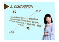 목차 1, Introduction - About discipline . 2, Point -A debate on discipline. (Yes or No) 3, Conclusion -the future of education suggestion. 본문 Do you think there is enough discipline in schools nowadays? What rights do you think teachers should have to discipline their student ? students rights are important, but teachers authority to teach students well is also crucial. Therefore, teachers must have the right to inflict a certain level of corporal punishment on students who behave overly improper, ignoring teachers in class. Students who are accustomed to disturbing the basic public order will not grow up to be democratic citizens 키워드 discipline, 영문, 훈육 |