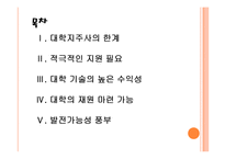 목차 목 차 Ⅰ. 대학지주사의 한계 Ⅱ. 적극적인 지원 필요 Ⅲ. 대학 기술의 높은 수익성 Ⅳ. 대학의 재원 마련 가능 Ⅴ. 발전가능성 풍부 본문 Ⅰ. 대학지주사의 한계 이제까지 대학 지주사는 벤처캐피털 등 자본시장 플레이어들과 격리돼 있었다. 대학 내 벤처는 대학 재정 지원을 받는 대학 지주사 등에서 투자를 받는 것이 고작이었다. 대학에서 탄생한 원천기술이 사장되는 것을 막기 위한 금융자본 역할이 커지고 있다. 대학교는 우수한 인재들이 학문을 배우는 곳이다. 대학교에서는 교수진을 중심으로 하여 우수한 인재들과 함께 다양한 연구활동을 벌이게 되는데 이러한 연구를 통해서 성과가 발생하기도 한다. 우리나라의 경우에는 다른 나라에 비해서 대학교 진학률이 높은 편이다. 이는 많은 국민들이 높은 상위 교육을 받는 다는 것을 의미한다. 그만큼 국가적인 교육수준이 높다는 것을 의미하기도 한다. 많은 사람들이 대학교에 진학하고 우수한 인재들이 대학을 통해서 양성됨에 따라서 대학이 새로운 가치 창출 지역으로 여겨지고 있다. 대학에서 우수한 인재들을 바탕으로 연구활동을 하게 되면 성과를 통해서 이익이 창출되는 것이다. 참고문헌 참고자료 http://news.mk.co.kr/newsRead.php?year=2013&no=57324 <매일경제> http://www.hankyung.com/news/app/newsview.php?aid=201212054249e <한국경제> http://www.anewsa.com/detail.php?number=428161&thread=09r02 <아시아뉴스통신> http://www.hkn24.com/news/articleView.html?idxno=112935 <헬스코리아뉴스> http://news.naver.com/main/read.nhn?mode=LSD&mid=sec&sid1=102&oid=038&aid=0002315880 <한국일보> http://www.sjbnews.com/news/articleView.html?idxno=409858 <새전북신문> http://www.apparelnews.co.kr/naver/view.php?iid=43731 <어패럴뉴스> http://article.joinsmsn.com/news/article/article.asp?total_id=10033900&cloc=olink|article|default <중앙일보> http://www.mt.co.kr/view/mtview.php?type=1&no=2012070913415189930&outlink=1 <머니투데이> http://www.mt.co.kr/view/mtview.php?type=1&no=2012112611540145096&outlink=1 <머니투데이> 하고 싶은 말 산학협동 지식재산 투자확대와 산학협력 강화 PPT자료 키워드 산학, 산학협력, 산학협동, 지식재산, 대학 |