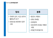 목차 서론 직업1_여행안내원 직업2_의료관광코디네이터 기업1_롯데호텔 기업2_대한항공 본문 정의 국제적 감각, 식견, 외국어 활용능력 요구 관광산업 현장에서 업무 수행 분류 항공사, 여행사 공항, 면세점, 관광업계 관광 통역 안내원, 여행안내원, 호텔근무(호텔리어) 수입과 인력고용 창출 면에서 지구상 가장 큰 경제부문 주요 관광선진국들은 지역 개발의 정책수단으로서 관광산업을 전략산업으로 집중 육성하고 있으며 국내에서도 정부차원에서 관광산업을 21세기 국가전략산업 및 국가균형 발전 산업으로 선정, 관광진흥정책을 수립, 적극적으로 육성. 여가시간의 증대와 소득 향상, 더 나아가 삶의 질 향상을 위하여 관광, 호텔사업은 레저형 도시와 자유도시지역의 관광, 여행상품화 부각 등으로 고부가가치를 창출하고 있으며 앞으로도 지속적으로 발전될 전망 키워드 관광, 관광산업, 안내원, 산업, 호텔, 여행안내원, 의료관광코디네이터, 역량개발 |