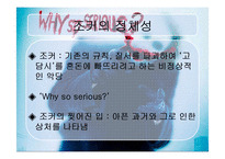 목차 1. 가면이란? 2. 조커의 정체성 3.가면의 의미 변신 공포 풍자 혼돈 4. 결론 본문 가면이란? 가면 : 얼굴을 가려 변장을 하거나 얼굴을 방호하기 위하여 쓰는 조형물 가면의 이중성 : 정체성의 드러냄과 감춤 분장(make-up) : 회화, 도안, 판화, 조소의 요소를 도입하여 신체표면을 인위적으로 조형하는 것 조커의 정체성 조커 : 기존의 규칙, 질서를 파괴하여 '고담시'를 혼돈에 빠뜨리려고 하는 비정상적인 악당 'Why so serious?' 조커의 찢어진 입 : 아픈 과거와 그로 인한 상처를 나타냄 키워드 다크나이트, 조커, 정체성 |
