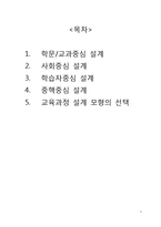 목차 1. 학문/교과중심 설계 2. 사회중심 설계 3. 학습자중심 설계 4. 중핵중심 설계 5. 교육과정 설계 모형의 선택 본문 교육과정 설계 교육과정을 구성하는 요소를 적합한 원칙과 원리에 따라 배치하는 것. 1. 학문/교과중심 설계 학문중심, 교과중심 교육과정의 설계에 있어서 학문과 교과는 동일하지 않고, 학문이 교과에 포함된다. 즉, 하나의 학문이 하나의 교과를 구성하기도 하고, 여러 학문이 하나의 교과를 구성하기도 한다. 학문/교과중심 설계를 하는 가장 큰 이유는 이 설계 모형이 학문들속의 지식, 가치, 기능을 습득하는데 효과적이기 때문으로 스푸트니크쇼크 이후 급속도로 발전하기 시작한다. (1) 개별학문 설계 개별학문 설계는 학문의 구조에 의하여 교과를 만들고 구성하는 설계형태를 말한다. 각 학문의 개별적 독립성을 존중하는 형태로 가장 흔하게 사용되는 방식이다. 장점 국가수준의 교육목적과 목표가 모든 학년 각 학문분야에 명확히 제시될 수 있다. 수업자료, 검사도구 등이 학문마다 충분하기 때문에 효율적이다. 개별학습으로 학습자는 한 분야에 전문화된 기술과 개념을 체계적으로 배울 수 있다. 단점 교과의 분절화로 학문간의 관련성을 인지할 수 없다. 학생의 욕구보다는 교과위주의 수업이 될 수 있다. 예) 과학, 수학, 영어와 같은 단일교과 키워드 교육과정설계모형, 교육, 과정, 모형, 설계 |