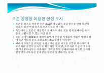 목차 오존 처리 공정 서론 본론 본문2 및 결론 본문 오존 공정 특성 오존은 염소보다 강한 산화력으로 바이러스와 다른 불순물과 반응하여 세포막을 파괴시킴으로 염소보다 살균효과가 우수함 오존은 THMs전구물질과 맛과 냄새의 제거, 철과망간의 산화, 색도제거, 미생물, 조류의 살균까지효과적이다. 오존은 주입 후 산소로 분해가 되므로 용존산소높여 꼭 제거해야만 하는 화학적 잔류물이 존재하지 않는다는 점이있음 오존 공정을 이용한 현장 조사 오존을 최초로 적용한 곳은 1893년 네덜란드 오순정수장 인데 라인강 강물은 침전 여과 등으로 오존소독을 실시함. 독일에서는 오존은 생물학적 분해가 어려운 것을 쉽게 분해하는 유기물로 전환시킬 수 있는 사실 발견 모든 곳에서 BDOC를 활성탄표면에 부착된 미생물의 생물학적 산화법에 오존처리와 온도 조절로 O3+BAC공정을 터득함* 따라서 프랑스를 비롯한 유럽지역은 물론 미국을 포함한 북미지역에 오존처리 공정이 급속도로 확산되었다. 반면, 오존처리 기술이 정수처리 기술분야에서는 미흡하다. 그리고 도입 상태에 따라 과도한 소비와 현장생산마다 다른 문제점들이 간혹 발생하기도 한다. 참고문헌 서론 참고문헌 1.상수도 공학(일반 및 고도 정수처리) *출판사: 동화기술의 김동윤 저 *목차: 고도 정수처리 *17장의 BAC에 의한 고도정수처리 17.1.서론 17.2.일반적인 정수처리 공정도와 BAC에 의한 고도 정수처리 공정도 2. 수처리 공학 *출판사: 형설(이규성과 조웅현 외 5명) *목차: 화학적 처리기술 5장의 4절 산화기술 ㉠산화개요 ㉡오존처리 ㉢활성탄 및 오존/AOP 공정을 이용한 고도정수시설 본론1 1.이성우 외 6명, 고도상수처리, 동화기술, pp.71~196. 2003 2.양상현 외 2명, 상하수도공학, 동화기술, pp.407~411, 2006 3.종중공 편저 오존을 이용한 수처리 기술 동화기술, 2002 4.단보헌인.소립원현 편저 용수처리, 동화기술, 2004 본론2 및 결론 1. 오존을 이용한 수처리기술 / 宗宮 功 / 동화기술 / 2002 2. 국내 고도정수처리 현황분석 및 적정운영방안에 관한 연구 / 박준형 / 계명대대학원 / 2009년 3. 국내 정수장의 오존처리 시설 현황 조사 및 평가 / 박훈수,윤제용 / 공동추계학술발표회논문집 / 2000년 4. 정수처리현황 / 한국수자원공사 자료 키워드 오존처리공정, 용수처리공학, 처리, 공정, 용수 |