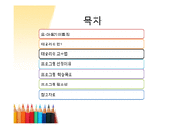 목차 유 아동기의 특징 태글리쉬 란? 태글리쉬 교수법 프로그램 선정이유 프로그램 학습목표 프로그램 필요성 참고자료 본문 2) 아동기의 특징 아동기 공식적 제도의 생활을 통해 경험이 넓어짐 교사를 통해 사회규범,교과지식습득 또래와 공동생활을 통해 타인에 대한 이해의 폭이 넓어짐 태권도 + 영어 ↓ 기존 태권도의 큰소리로 말하는 방식 (샤우팅방식) 실생활에서 사용하는 영어 문장을 이용한 회화 지도법 키워드 아동기, 교육프로그램, 태글리쉬, 프로그램, 교육 |