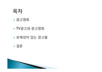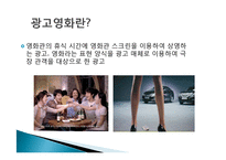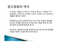 목차 광고영화 TV광고와 광고영화 유해성이 있는 광고물 결론 본문 광고영화란? 영화관의 휴식 시간에 영화관 스크린을 이용하여 상영하는 광고. 영화라는 표현 양식을 광고 매체로 이용하여 극장 관객을 대상으로 한 광고 광고영화의 역사 초기에는 영화가 시작되기 전에 보여주는 "끼워넣기"식 상영에서 시작(TV 광고를 그대로 가져와 다시 보여주는 재활용 형태로 진행) 2000년대 초반 상영관이라는 장소적인 특징과 영화를 보러온 관객을 대상으로 한 광고라는 점을 염두한 타겟 광고들이 등장(예:에티켓 광고) 최근에는 영화에 광고를 접목하는 동시에 광고에 영화를 이용한 형태가 등장(예:시네마 애드) 키워드 광고물, 표현, 광고영화, TV광고, 광고영화 |