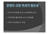 목차 컨텐츠 산업이란? 컨텐츠 산업 육성의 필요성 해외 컨텐츠 산업의 성공사례 및 시사점 국내 지역 콘텐츠 산업의 현황 및 문제점 발전전략 및 과제 본문 콘텐츠 산업 육성의 필요성 지역 내 문화생산 및 소비잠재력 증가 지역경제 활성화와 신규고용창출 지역 내 문화인구 유입 해외사례 및 시사점 사례 1산업형 : 영국 테이트 모던 1981년에 중단된 이후 오랫동안 방치 연간 광광객 520만 명 방문 해외사례 및 시사점 사례 2축제형 : 프랑스 앙굴렘 프랑스 서남부에 위치한 인구 10만명의 작은 도시 현재는 세계적인 출판 문화 축제가 열리는 지역 키워드 발전전략, 지역경제, 지역, 콘텐츠, 산업 |