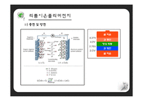 목차 리튬이온폴리머전지 리튬이온전지 vs 리튬폴리머이온전지 문제점 & 개선 방안 결론 참고 문헌 본문 장점 초경량, 고에너지 밀도 안전성 고출력 전압 낮은 자가방전율 긴수명 환경친화 →액체 전해질형 리튬이온 전지의 단점인 안전성 문제, 제조 비용의 고가, 대형 전지제조의 어려움, 고용량화의 어려움 등의 문제를 해결할 수 있을 것 많은양의 액체가소제와 혹은 용매+폴리머 매트릭스 순수-고분자 전해질에 비하여 상온에서의 높은 이온전도도와 불량한 기계적 성질 cross-linked나 thermoset할 수 있는 물질들을 첨가 → 전기화학적 안정성은 액체 전해질에서와 유사 높은 이온 이동도와 높은 전하수송물질 농도를 나타내어 주된 성능향상을 이루었고, 저온특성도 우수 고분자 매트릭스를 submicron이하로 다공성하게 만들어 유기용매 전해질을 이 작은 기공에 주입 전해질은 이온전도도가 유기용매 전해질의 이온전도도와 같은 특성을 갖고 있고, 용이하게 제작가능 참고문헌 리튬이차전지용 음극 소재 기술 개발 동향/김성수/삼성SDI 중앙연구소 에너지랩/2008 리튬 이온 폴리머 전지의 사이클 수명 모델링/김의성 이정빈 이재신 신치범 최제훈* 이석범*/ 아주대학교 에너지시스템학부 화학공학과/2009 불화 알루미늄을 포함하는 표면 개질된 분리막으로부터 제조되는 리튬이온폴리머전지의 싸이클 특성에 관한 연구/어승민 김동원/한밭대학교 응용화학과/2008 리튬이온 2차전지용음극 재료 개발 동향/ 홍영식/ 서울교육대학교 과학교육과/ 2009 리튬이온폴리머전지용 가교형 겔폴리머전해질의 중합조건 최적화 연구 / 김현수, 문성이느 김상필 / 2005 키워드 전지기술설계, 리튬폴리머, 전지, 리튬이온폴리머전지 |