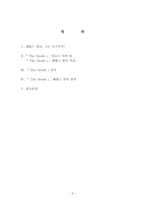 목차 Ⅰ. 헤롤드 핀터, 그는 누구인가? Ⅱ.『 The Sleuth 』, 안소니 샤퍼 와 『 The Sleuth 』, 헤롤드 핀터 비교 Ⅲ. 『 The Sleuth 』분석 Ⅳ. 『 The Sleuth 』, 헤롤드 핀터 번역 Ⅴ. 참고문헌 본문 Ⅰ. 헤롤드 핀터, 그는 누구인가? 1. 서론 본 글에서는 Harold Pinter(이하 핀터)의 마지막 각색 작품인 영화 Sleuth를 통해서 핀터의 개인적인 삶과 그가 논하고자한 정치 성향을 이야기 하고자 한다. 핀터의 가치관과 그가 작품을 통해서 이야기 하고자 한 시민들의 무관심과 부조리한 현실 투영, 그리고 각색을 통한 개인적의 삶의 정리에 관해서 핀터의 대표적인 부조리극이란 관점에서 논하려고 한다. 2. 본론 1) 핀터의 극작 동기 핀터는 어린 시절부터 극작가로서 활동과 가치관에 밀접한 영향을 받을 일들을 시작한다. 동런던의 핵크니 문법학교를 다니고 어려서부터 영어와 연극, 운동에 재능을 보이며 특히 학교 연극에서 두각을 들어내기 시작한다. 졸업 후 왕립 연극 아카데미에 입학하지만 두 번이나 학교를 그만두는 이력을 가지고 있다. 핀터의 가치관중 하나인 반전주의를 가지게 되는 큰 사건이 있었는데 바로 양심적 병역 거부다. 핀터는 현재에는 직업군인제도가 정착되었지만 당시에는 영국에도 병역의 의무가 존재하였다. 핀터는 양심적 병역 거부자였다. 그가 18세이던 1949년 10월에 영장을 받자마자 핀터는 양심적 병역거부자로 등록하여 '국가의 요구를 거절할 수 있는 개인의 양심'을 선택하였다. 당시 유럽은 1948년 소련의 베를린 봉쇄로 냉전이 최고조였던 긴박한 시기였다. 이런 시기에 18세의 젊은 나이에 개인의 양심을 확실하게 선언할 수 있었던 결단은 이후 그의 인생에서 중요한 좌표가 되었다고 그는 여러 인터뷰에서 밝히고 있다. 양심적 병역거부의 결과 두 차례 군사법정과 두 차례의 민간법정에서 수백만의 인명을 앗아간 2차 대전을 경험한 그는 수백만의 기아와 죽음을 의미하는 전쟁을 양심에 의거해서 거부한다고 밝히면서 병역의 의무를 단호하게 거부하며 감옥행을 택했다. 하지만 부유한 집안이었던 핀터는 아버지가 그가 감옥을 가는 막기 위해 벌금을 두 차례 납부하여 감옥을 가지 않은 양심적 병역 거부자가 되었던 것이다. 이러한 젊은 날의 양심적 결단은 사회와 개인의 부조화를 주제로 한 끊임없는 그의 문학의 주제를 탐구하는 원동력이 되었다. 뿐만 아니라 이러한 양심적 병역거부의 결단의 그를 끊임없이 거리로 나서 반전, 인권, 평화의 대열에 앞장서게 했고, 이러한 그의 인생은 그를 노벨문학상 수상자로 만들어낸 것이다. 이런 반전주의는 핀터는 2차대전 중 독일군의 폭격 속에서 느낀 생명의 위협과 그 당시 유럽을 지배하고 있던 사상중 하나인 파시스트적 반 유대주의에 의해 핵크니 거리에서 파시스트들에게 집단 폭력을 받은 사건이 있다. 이런 인종차별과 전쟁이 가지고온 공포가 핀터의 의식과 결합되어 나온 산물이다. 하고 싶은 말 좀 더 업그레이드하여 자료를 보완하여, 과제물을 꼼꼼하게 정성을 들어 작성했습니다. 위 자료 요약정리 잘되어 있으니 잘 참고하시어 학업에 나날이 발전이 있기를 기원합니다 ^^ 구입자 분의 앞날에 항상 무궁한 발전과 행복과 행운이 깃들기를 홧팅 키워드 레포트, 헤롤드, 영문학 |