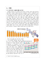 목차 1. 서론 1)100세 시대의 도래 2. 본론 1)고령화에 따른 노동시장 전망 2)문제점과 대안 3)고령인구의 재고용 방법 3. 결론 * 부록 1. 참고문헌 본문 1. 서론 (1) 우리나라의 고령화 현황 및 추세 고령화란 고령자의 수가 증가하여 전체 인구에서 차지하는 고령자 비율이 높아지는 것을 말한다. 고령화의 동향은 일반적으로 고령화율로 나타낸다. 고령화율이란 65세 이상의 고령자 인구(노령인구)가 총인구에서 차지하는 비율로 나타내는 것이 일반적이다. 국제연합은 65세 이상의 인구가 4% 미만인 사회를 연소인구 사회 , 4% 에서 7% 미만의 사회를 성숙인구 사회 , 7%를 넘는 사회를 고령화(aging) 사회 , 14%를 넘는 사회를 고령(aged) 사회 라고 한다. 또한 고령사회에서 더욱 고령화가 진행된 사회를 초고령 사회라고 하는 경우도 있다. 고령화가 진행되기 위해서는 분모(총인구)의 값이 감소하고 분자(65세 이상 인구)의 값이 증가해야 하는데, 이것을 설명하기 위해서는 2가지 사회적 측면에 대한 설명이 필요하다. 바로 낮은 출산율과 평균수명의 신장이다. 우리는 100세 시대 즉 평균수명의 신장에 따른 상황들에 초점을 맞춰서 내용을 진행해 나갈 것 이지만, 고령화 사회의 현황과 추세를 설명하기 위해 분모의 값의 감소부분, 즉 저출산의 부분도 간단하게 짚고 넘어가도록 하겠다. 참고문헌 1.참고문헌 1)네이버 블로그 '인구구조변화가 부동산 시장에 미치는 영향' http://blog.naver.com/ehrroql69?Redirect=Log&logNo=150098404514 2) 한국금융연구원, 2011년. 3월, '고령화 진전에 따른 정책과제' 3) 삼성경제연구소, 2011년. 8월. 3일, '고령화에 따른 노동시장 3S 현상 진단' 4) 네이버 블로그 '외로운 노인들의 최후의 선택, 노인자살' http://enjoykimmi.blog.me/60141987411 5) KBS뉴스, 2011.05.27., "은퇴 무방비" 임금피크제가 대안? http://news.kbs.co.kr/society/2011/05/27/2298521.html 6) 보건복지부, 2011. 3. 8, 「자립형 노인일자리」, 노동시장에서 취업 물꼬 튼다 ! 7) 노동경제학, 대구경북 사회적기업지원센터 박진영, 2011. 10. 17, 사회적 기업의 이해 8) 노인행복, 이미정, 2010. 6. 4, 노인일자리 해법, 사회적 기업이 뜬다 키워드 노동시장, 세, 시대, 경제학, 노동 |