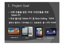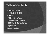 목차 Ⅰ. Project Goal 대상 제품 소개 Ⅱ. AHP 1) Decision Tree 2) Weighing Criteria 3) PCM & Consistency 4) Result Ⅲ. Conclusion 본문 Ⅰ. Project Goal 사회 진출을 앞둔 20대 서강인들을 위한 Tablet PC 국내 출시된 Tablet PC 중 Best Selling TOP4 갤럭시 탭10.1 / 아이패드 2 / 모토로라 줌 / HTC FLYER 2) Weighing Criteria Weights for Criteria √ 스마트 폰 정보 포털 '앱스토리' √ 733명 이용자 Weights for Subcriteria √ PCM √ Facebook 설문조사(쌍대비교) √ 34명 20대 서강인 키워드 경영과학, PC, 테블릿, AHP, 과학 |