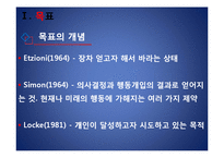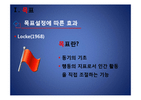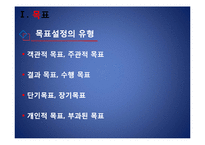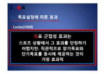 목차 목표의 개념 목표설정의 유형 목표설정에 따른 효과 목표설정의 원리 본문 Etzioni(1964) - 장차 얻고자 해서 바라는 상태 Simon(1964) - 의사결정과 행동개입의 결과로 얻어지는 것. 현재나 미래의 행동에 가해지는 여러 가지 제약 Locke(1981) - 개인이 달성하고자 시도하고 있는 목적 객관적 목표, 주관적 목표 결과 목표, 수행 목표 단기목표, 장기목표 개인적 목표, 부과된 목표 목표란? 동기의 기초 행동의 지표로서 인간 활동 을 직접 조절하는 기능 키워드 목표설정, 목표, 설정, 스포츠 |