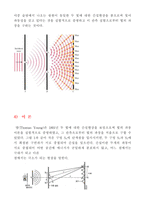 본문 광학 실험 영의 간섭 실험 1) 필요 부품 광학용 레일 2 ( 중 .소형) , LASER 1(633nm), 확산렌즈 1 , 줄맞춤 렌즈 1(+50). 이중실틈 1(1/1000mm), 대형 스크린, 렌즈 홀더 3 포스트와 포스트 홀더 4 2) 실험 과정 1. 광학 부품들을 윗 그림과 같이 레일 위에 정렬한다. 실틈에서 큰 스크린을 2m이상 떼어 놓는다. 2 무늬의 위치를 확인한다. 3. 무늬 간격을 측정하여 기록한다. 4. 스크린까지의 거리를 측정하여 기록한다. 5. 스크린까지의 거리를 변화시키면서 실험을 되풀이 한다. 3) 실험 목적 이중 슬릿에서 나오는 광원이 동일한 두 빛에 대한 간섭현상을 봄으로써 빛이 파동성을 갖고 있다는 것을 실험적으로 증명하고 이 관측 실험으로부터 빛의 파장을 구하는 것이다. 4) 이 론 영(Thomas Young)은 1801년 두 빛에 대한 간섭현상을 보임으로써 빛의 파동이론을 실험적으로 증명하였고, 그 관측으로부터 빛의 파장을 처음으로 구할 수 있었다. 그림 1과 같이 작은 구멍 So에 단색광을 입사시키면, 두 구멍 S1과 S2에서 회절된 구면파가 서로 중첩되어 간섭을 일으킨다. 간섭이란 두개의 파동이 서로 중첩되어 어떤 공간에 에너지가 균일하게 분포하지 않고, 어느 점에서는 극대가 되고 다른 점에서는 극소가 되는 현상을 말한다. 이중슬릿 실험간섭을 일으키기 위해서는 두개 이상의 파동이 같은 속도, 진동수, 파장 및 상대적 위상이 일정하게 유지되어야 한다. 수면파 간섭 실험에서 두 파동의 진동수와 파장이 똑같고, 두 파원 S1과 S2의 위상이 같을 때 일정한 모양의 간섭무늬를 볼 수 있다. 이와 같은 두 파동을 간섭성이 있는 파동이라고 한다. 그림 1에서 보강간섭을 일으키는 곳에 점을 찍어서 극대점으로 표시하였다. 어두운 부분(극소점)은 두 극대점의 중간에서 찾아볼 수 있다. 이와 같은 밝고 어두운 부분들이 스크린에 간섭무늬로 나타나게 된다. 그림 2는 두 개의 슬릿 S1과 S2에서 나온 빛이 스크린 위의 점 Q에서 만나는 것을 나타낸 것이다. 두 슬릿의 중간점으로부터 점 X까지의 연장선과 중심축 사이의 각도는 θ이고 중심축에서 X점까지의 거리는 이다. 이때 같은 광원을 출발한 빛을 사용하므로 S1과 S2를 지나가는 빛의 위상은 같다. 하지만 S1에서 X에 이르는 파동과 S2에서 X에 이르는 파동의 위상은 서로 다른 거리를 진행하기 때문에 다를 수가 있다. 즉, 경로차가 위상차를 일으키게 한다. 만일 경로차가 없거나 경로차가 파장의 정수배가 되었다면 두 파동은 정확히 보강간섭을 일으킨다. 그러나 경로차가 반파장의 홀수배에 해당한다면 두 파동은 완전히 반대이므로 상쇄(소멸) 간섭을 일으키게 된다. 따라서 점 X에서 완전한 보강간섭을 일으키려면 경로차 가 0이거나 파장의 정수배가 되어야 한다. 하고 싶은 말 좀 더 업그레이드하여 자료를 보완하여, 과제물을 꼼꼼하게 정성을 들어 작성했습니다. 위 자료 요약정리 잘되어 있으니 잘 참고하시어 학업에 나날이 발전이 있기를 기원합니다 ^^ 구입자 분의 앞날에 항상 무궁한 발전과 행복과 행운이 깃들기를 홧팅 키워드 간섭, 실험, 그림, 슬릿, 경로차, 스크린 |