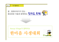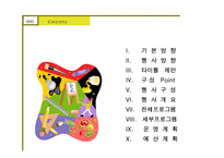 목차 기 본 방 향 행 사 방 향 타이틀 제안 구 성 Point 행 사 구 성 행 사 개 요 전체프로그램 세부프로그램 운 영 계 획 예 산 계 획 본문 사생대회는 모든 참가 회원자녀 + 가족에게 올해로 X회째를 맞이하는 사생대회는 회원가족을 대상으로 고객 로열티 제고 및 만족도 향상을 위해 국내최고 테마파크인 에버랜드에서 고객 사은 행사로 이어오고 있습니다 에버랜드의 아름다운 꽃의 정원과 동심을 담은 이솝빌리지의 동화이야기 와 함께 , 하고 싶은 말 사생대회 운영기획서 XX기업 후원 키워드 사생대회 운영기획서 XX기업 후원, 이베트 기획서, 이벤트 운영계획, 사생대회 운영계획, 후원행사 운영계획서 |